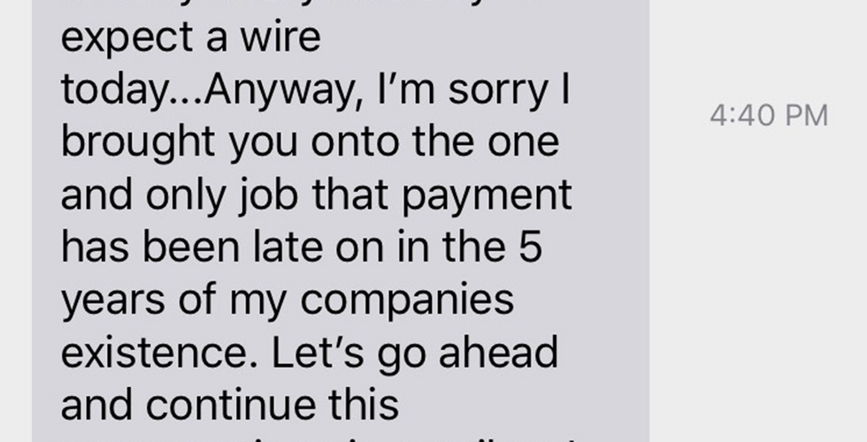 When those 30 days hit, I send an email stating that it has been 30 days and ask what's going on with the payment. It’s important to keep all correspondence polite and matter-of-fact. Producers are people too, and they can make innocent mistakes.